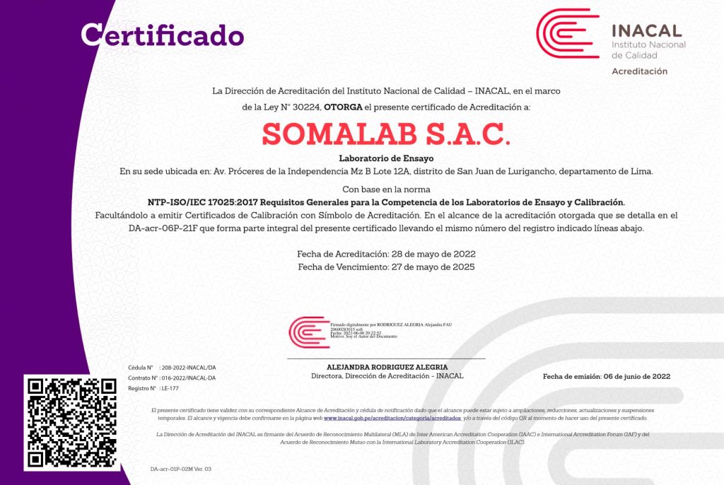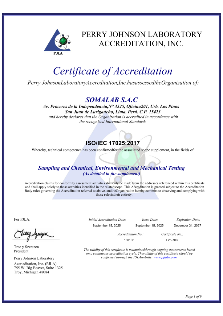 Estas acreditaciones garantizan que nuestros ensayos y mediciones cumplen con criterios de confiabilidad, trazabilidad y objetividad, brindando a nuestros clientes informes válidos ante organismos reguladores como OEFA, MINAM, ANA, DIGESA y SUNAFIL. Confiar en SOMALAB es confiar en un laboratorio que opera bajo normas verificadas, con resultados que sustentan decisiones clave para la seguridad, el cumplimiento y la sostenibilidad.